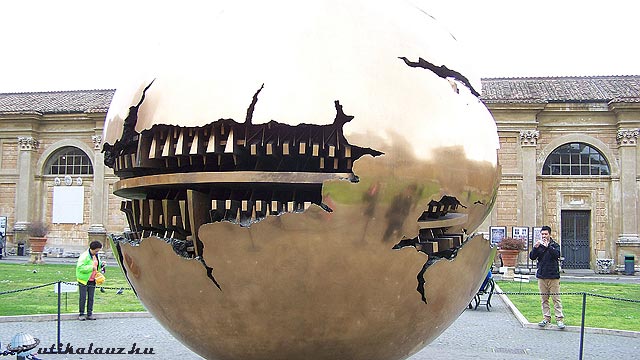 A következő állomás a Vatikáni Múzeum, hosszú volt a sor de jól haladt. A jegy 12 euró. Önállósodott idegenvezetők kínálták különböző nyelven szolgáltatásaikat. Átmentünk az átvilágításon és máris a “toboz udvara” (Cortile della Pigna) értünk, a nevét arról a hatalmas római kori fenyőtoboz alakú bronzszoborról kapta, amely a középkorban a régi Sz. Péter bazilika átriumának közepén állott. Ugyanitt találtam egy hatalmas vörösréz gömb alakú dolgot, ami azóta is érdekel, hogy mi lehet. Ez egy hatalmas, forgó gömb, amelyből előtűnik egy kisebb gömb. A mai napig nem tudom megfejteni, mi lehet az üzenete.