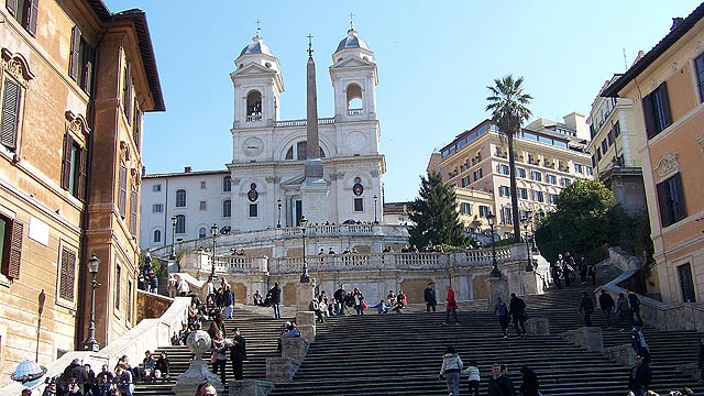 Minden téren belebotlottunk valami érdekesbe, fontos nevezetességbe. Így jutottunk el a Trinita dei Monti templomhoz, ahol rájöttünk, hogy a Spanyol lépcső tetején vagyunk. A templom előtt áll, az egykor Sallustius tulajdonát képező egyiptomi obeliszk.