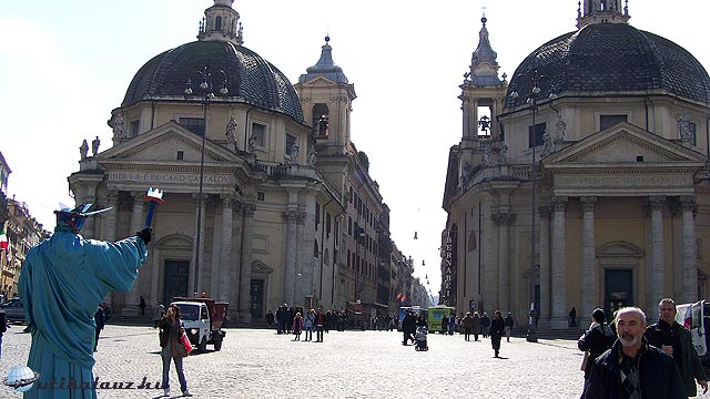 A tér bejáratánál áll két szimmetrikus templom, mintha egymásnak tükörképei lennének. Bementünk a Santa Maria di Montesanto, ahol éppen francia nyelven folyt a mise. A másik templom a Santa Maria dei Miracoli. Mindkettő Bernini keze munkája. Rómában lépten-nyomon Bernini műveibe botlunk bele.