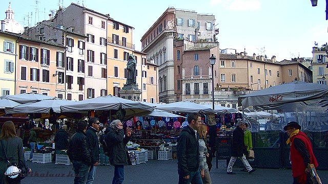 Pihenés után tovább folytattuk a sétánkat, a Ponte Principén átkeltünk a Tiberisen, végig mentünk a Via Giulian, ahol a Magyar Akadémia is található. Piazza dei Fioríni térre értünk, ahol éppen egy zöldség piac közepébe csöppentünk. A tér jelentősége hogy Giordano Bruno itt szenvedett 1600 február 17-én máglyahalált.