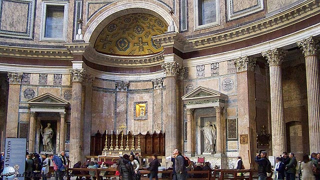 A Pantheont I. sz. 118-125 között építette újra a semmiből Hadrianus császár, ezt megelőzően kétszer leégett. Akkor még Santa Mária Rotonda-nak hívták. A hatalmas bronz kapuja még a római korból való. A kazettás mennyezeten egy 9 méter átmérőjű kerek nyíláson át jön be a fény. A templom sírboltjaiban nyugszik két olasz király II. Viktor Emanuel és I. Umbertó, valamint számos más nevezetesség is, mint Raffaelo és Vignola.
