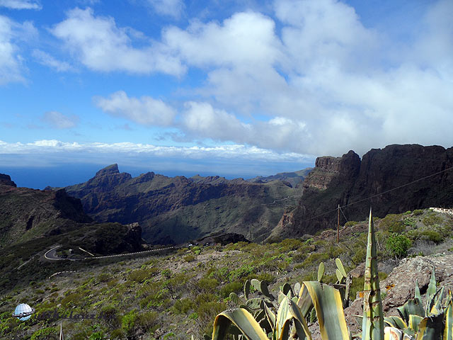 Utunk talán legszebb pontja (mindketten erre „szavaztunk”) Masca előtt, Santiago d.T. felől érkezve az első fényképező-pontnál „jött szembe” velünk. Mindenki álljon meg, aki arra jár! Jobbról-balról parkoló autók az út mellett, egy kilátóhely egy kisebb dombon. Egyik irányból a 900-1000 méter magas, csipkés sziklák, az oldalukban kanyargó apró szerpentinnel, mögötte a végtelen kékség, benne a távolban a La Gomera és La Palma névre hallgató szigetek. Megfordulsz, és a hatalmas, kaktuszos-pálmafás, viszonylagosan sík terep, és néhány kisebb hegy mögött magasodik a Teide. Néhány percre esetleg eléúszik egy felhő, hogy aztán újra megjelenjen a napsütésben, mint egy uralkodó, az ő népe előtt.