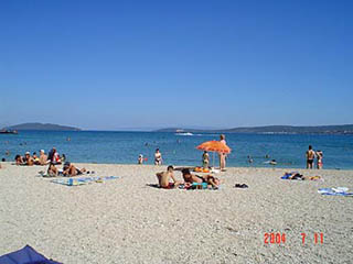 Mindenki lassan átvetkőzött fürdőruhába és rögtön indultunk is a tengerpartra. A part kövecses, sziklás. Napozóágyat nem lehetett bérelni, árnyékot a fák adtak, a strand szélén. Először letelepedtünk a víz közelébe, és máris indultunk a vízbe. Kezdetben hideg volt, miután megszoktuk, már egész kellemes . A strand kisebb öblökből állt, de nem volt se széles se hosszú.