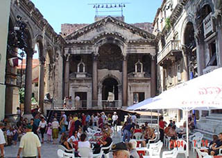 Rögtön ott találtuk magunkat a város egyik legnevezetesebb épületénél Diocletianus császár palotája előtt. Köréje egy igazi piac épült, ahol főleg a ruha, cipő, ajándék volt a fő sláger. De lehetett kapni gyümölcsöket is. Körbejártuk nagyjából a palotát, és egy hatalmas szoborhoz jutottunk ki, nem tudtuk kit ábrázol, de gondoltuk lefényképezkedünk. Később tudtuk meg, ha megfogod ennek a szobornak a lábát, akkor szerencsét hoz.