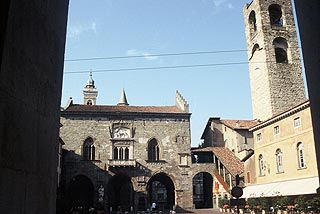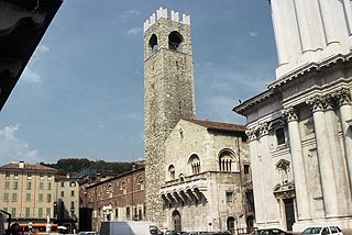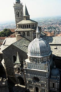 Természetesen az egyetlen megmaradt lakótornyát éppen renoválták, így a látványt eltakarta a bevonat. A régi, román stílusú dóm – Santa Maria Maggiore – csodaszép, nem különben az előtte levő városháza épülete. A templom tele van óriási méretű gobelinekkel, ezek döntő része XVI. századi, és az utóbbi pár évben sorra restaurálták. Jó volt látni ilyet – mint korábban Franciaországban – hogyan is nézhetett ki akkoriban egy templom – a falakat gobelinek, vagy más borította (bár én szeretem az épület szerkezetét látni). Mellé építette az egyik condottiere a lánya temetési kápolnáját – Colleoni-kápolna -, kicsit odébb pedig a keresztelő kápolna áll. Mindezektől pár méterre áll a reneszánsznak indult, aztán inkább klasszicistává módosult dóm.