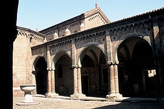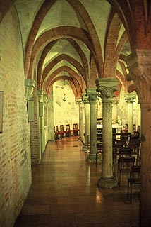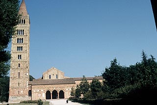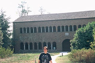 Ezt követően Pomposába mentünk, ahol egy VII. századi alapítású bencés kolostor és monostor maradt meg viszonylag jó állapotban – a XIV. században hagyták el a kolostort, amikor az egész terület már teljesen mocsarassá és így jelentéktelenné vált. Egyébként itt élt évtizedekig Arezzoi Guido is, aki a szolmizálás atyja. Az idők elején egy szigeten volt a kolostor, aztán a tenger messzebbre kerülése a hanyatlást hozta magával – mocsarassá vált és járványok tizedelték emiatt az itt élőket. Sok freskó és padlómozaik is maradt meg a XI. századi építésű templomban – ez is mutatja, hogy nem maradt a fősodorban a terület, nem fosztották ki és nem cserélték ki újabbra, divatosabbra az évszázadok során. A freskók képes bibliaként rengeteget mesélnek a mai embernek is – több sávban vannak a képek. A padlómozaik is csodálatos, de a kolostorépületben is vannak még freskók. A VI. századi kereszténység bizánci útját mutatja, bár némi római hatást is fel lehet fedezni – a könyvek szerint. Mi csak ámultunk-bámultunk. Az akkori bíróság épülete is megmaradt, ma az a bejárat az épületegyüttesbe. Mondanom sem kell, hogy ez sincs benne a mi 1966-os útikönyvünkben.