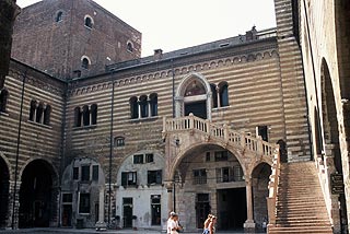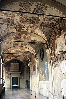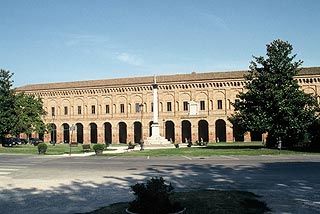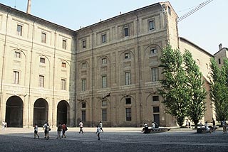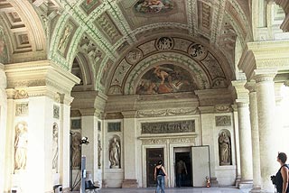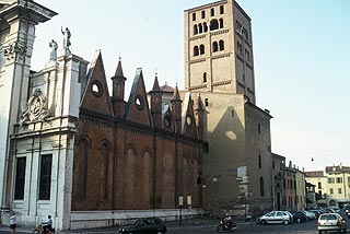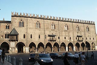A kijövetel után még a dómba is bejutottunk – épp véget ért a mise. Ez kívülről téglagótikus, de belülről már későbbi korok nyomják rá a bélyeget, sőt egy klasszicista homlokzatot építettek elé. A főhajó gazdagon díszített, aranyozott kazettás reneszánsz famennyezete azonban lenyűgözött. Mantova földrajzi helyzete eleve csodálatos, három tó között fekszik, a vár ezek csücskében van – mögötte fekszik az előbb említett Palazzo Ducale. A városba még néhány nap múlva visszamentünk a XVI. századi építésű Palazzo Te-t megnézni – ami egy eléggé különleges épület, a maga méreteivel, termeivel. Ez a hercegek nyári palotája, érdekes, extravagáns termekkel – pl. az egyikben kizárólag lovak vannak a freskókon. Kertje is szép, korszakos jelentőségű épület, mintaként, hivatkozásként, viszonyítási pontként szolgált – pl. a bajorországi Landshutban is egy palotánál (amire kifejezetten ez az utalás miatt voltam kíváncsi pár évvel később a németországi utunkon).
