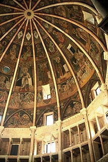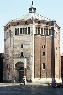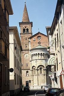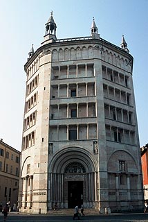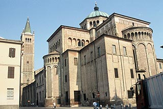 Másnap könnyített nap következett. Pármával kezdtünk, ahol a városháza után a gótikus dómot néztük meg, majd pedig a keresztelőkápolna következett. A dómban épp temetésre készültek, így nagyon nem volt módunk körbejárni. A szentély a hajó szintjénél úgy egy emelettel magasabb. Az épület tömege és tagoltsága hátulról látszott igazán. Egyébként említésre méltó, hogy a dóm szentélyének csúcsától 8-10 méterre már egy másik, szintén elég nagy templom homlokzata állt. Ilyesmit aztán több helyen láttunk még. A keresztelőkápolnának (baptisterio) döbbenetes hatása volt, az eredeti, építéskori (XII. század vége!) freskók friss színekben pompáznak ma is, s mivel a freskók alkotója az építész maga volt, így a tökéletes stílusharmóniát tapasztalhattuk meg. Nagy nehezen megtaláltuk a Farnese palotát, ami szerintem egyszerűen ronda. Óriási épületegyüttes, nagyon magas szintekkel, benne múzeummal, de oda nem mentünk be. Utána sikerült elkevernem magunkat, rossz irányba jöttünk ki a városból, így véletlenül láttunk kívülről egy aranyos várat Montechiorugolóban – természetesen szieszta volt.