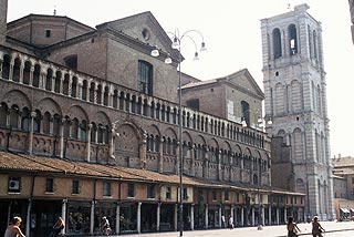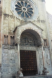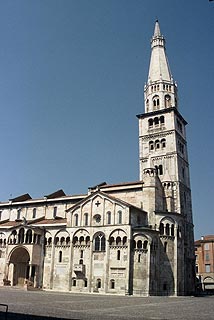Modenában csak a dómot néztük meg. Ez egy lombard stílusú románkori templom, lenyűgöző volt. Monumentális és gazdagon díszített volt, megemelt szentéllyel. A főteret a templom hosszháza és kereszthajója zárta le az egyik oldalról, a homlokzata a bejárati kapukkal egy másik, kis térre nyílt.