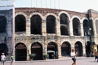 . az arénánál csak érvényesíttetni kellett a jegyet és nem pedig sorba állni. Az is igaz, hogy itt szembesültünk először az iszonyú méretű turistaáradattal és annak primitivitásával. A kreált Júlia-háznál pl. szinte úgy kellett beverekedni magát az embernek már az udvarra is a kapualjon át – az épületben állítólag szép belsők vannak kiállítva, de nem furakodtunk be. A kapualj teljes magasságban tele van firkálva „szerelmesek” neveivel, folyamatosan firkálnak egyszerre legalább négyen-öten. Iszonyatos – főleg, hogy az erkélyt 1935-ben illesztették az épületre. Kicsit hasonló volt az Arénánál is a helyzet, de ott a nagyobb tér miatt nem volt ennyire nyomasztó. Igaz, az arénából nem sokat lehet látni, mert az operaelőadások miatt a színpad és a modern ülések az épületmaradvány nagyobb részét eltakarják. Nekem azért így is megérte, főleg