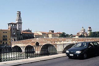 Ahol lehetett, kerültük a turistákat – pl. az Adige folyó partján mentünk a csipkés téglavárhoz. A Scaligeri-vár kiállítása óriási képzőművészeti anyag, Mantegna, Veronese, Tintoretto és sok egyéb festménnyel. Gondoltak a gyengénlátókra is, sok festmény domborképe is el van helyezve – kb. A/3 méretben a kép mellett. A vártól vezet át egy középkori híd a túloldalra. De mi nem itt, hanem a helyreállított római hídon mentünk át néhány római kori emlékhez – színházhoz, múzeumhoz. Volt még a városban római diadalív, városkapu, a mai földszinthez képest több méterrel lejjebb volt akkor a járószint – itt is a feltöltődést láthattuk.