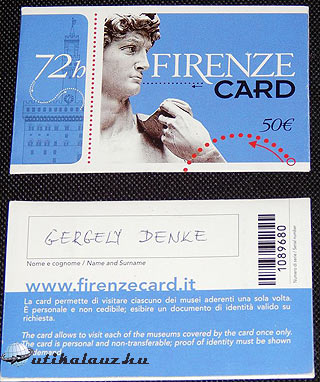 Csak egy helyre nem volt érvényes, ahova bementünk, a San Lorenzo templomba (de a Medici temetkezési kápolnába érvényes volt). Szóval, ha valaki sok helyre szeretne bemenni, annak nagyon megéri. A honlap címe: http://www.firenzecard.it/
