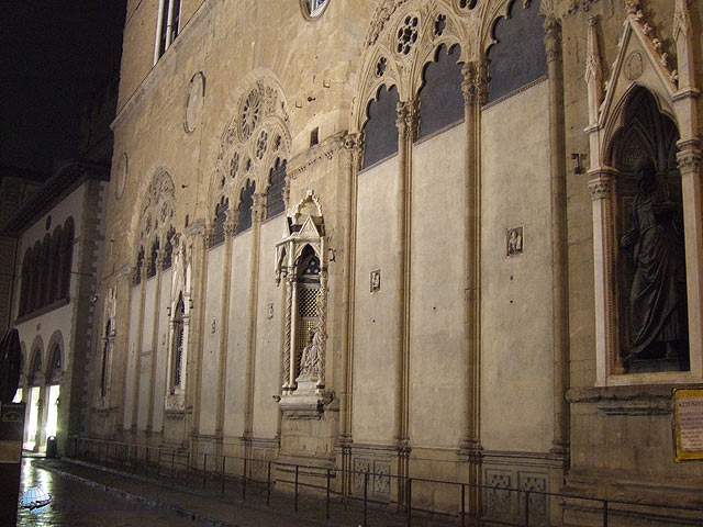 Kb. 200 méterre van az Orsanmichele templom, mely egy leégett fedett “vásárcsarnok”-ból, a céhek pénzéből, templomként újraépítve jött létre 1404-re. Ennek megfelelően annak formáját “örökölte”, vagyis egyszerű négyszög, belül pedig kéthajós, gótikus. Rengeteg szobor díszíti, főleg kívülről, melyekre mindig jól esett rápillantani, ha mellette vezetett el az utunk. Belülről is szokatlan a formája és elrendezése – mind a két hajóban van egy-egy oltár. Ide mindenképpen érdemes bemenni, hiszen a város szívében van, ahol mindenki megfordul, ha már Firenzében jár, és rövid idő alatt egy jelentős gótikus templomot lehet megnézni.