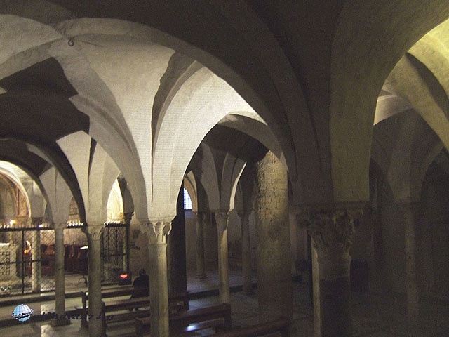 A “monte” szót komolyan kell venni, a folyótól elfordulva valóban igen meredek hegyre kell felkaptatni a lépcsőkön, s nekünk az esetleges bezárási veszély miatt még sietni is kellett. Háromhajós, altemplomos, márvány berakásos díszítésű, sok neves művésztől származó alkotásokkal díszített, lenyűgözően egységes és harmonikus, XI-XIII. századi épület – eleve nagyon kevés a fény, ezt az esős koraeste csak tetézte. Sajnos a sötétben csak töredékesen lehetett bármit is látni. Az emberi szem csodája, hogy ezzel együtt élvezhető volt, de a fényképeken alig látszik bármi is.