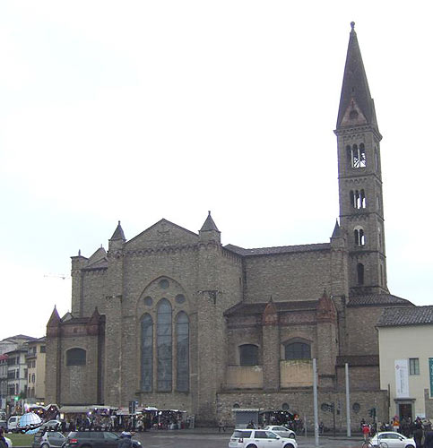 Alapvetően a XIV. században épült, gótikus, háromhajós, nyitott fedélszékes kolostortemplom, melyben sok síremlék van. A legnagyobb, sajnos befogadhatatlan mennyiségű élményt azonban a XIV-XVI. századi freskók jelentik. És még csak ez után következik a Brunelleschi tervezte Pazzi-kápolna az első udvarban – amelyet Luca della Robbia kerámiái díszítenek. Na, azt hiszem, ez a reneszánsz egyik esszenciális épülete. Még egy udvar, ahol a kolostor múzeuma van több teremben, szintén álomszép, régi műalkotásokkal. Az sem segítette a befogadást, hogy egész nap esett (bár ez szinte végig így volt), így a fény hiánya fakóvá tett sok mindent, és az épületekből szinte semmit sem lehetett távolabbról, nyugodtan megnézni – igyekeztünk fedett helyre, ahogy csak tudtunk.