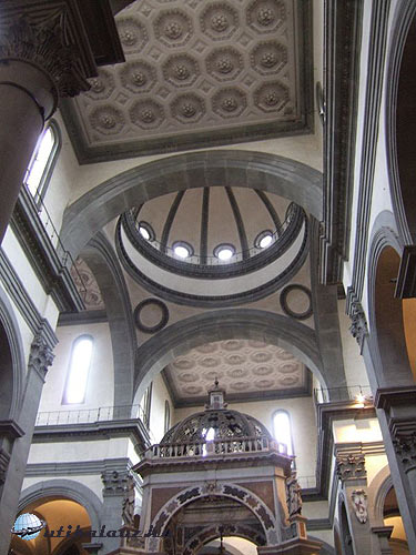 Egy kis háztömb körüli sétányira van a Santissima Annunziata tér, melyen egy kicsit el lehetett volna időzni. Minden oldalról reneszánsz stílusú homlokzatok tekintenek ránk – nem egy esetben még korábbi épületek átépítéséről van szó. Nagyon egységes, négyszögletes, elég zárt tér. A térnek nevet is adó templomot Michelozzo építette át a XV. században, jellegzetes reneszánsz templommá formálta át – nekem inkább világias jellege van -, gazdagon díszített minden része. Külön előcsarnoka is van – mára ezt üveggel fedték le -, melyből be lehet lépni a templomtérbe. Épp mise volt, de intettek, hogy nyugodtan menjünk be, így csendben körbejártunk. Érdekes, hogy a hajó bal hátsó sarkában egy baldachinos oltár van, a mise is itt folyt.