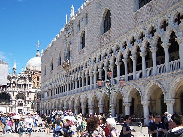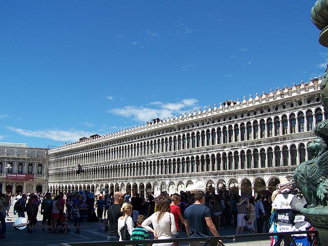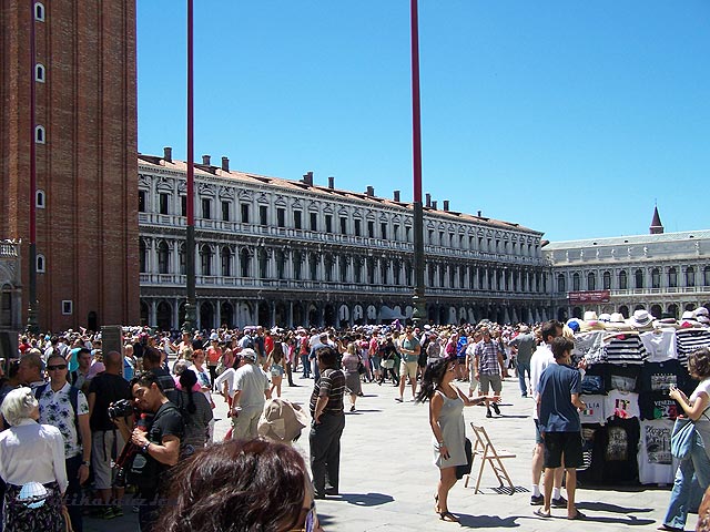 Kellően elfáradva érkeztünk meg a Szent Márk térre. Ott azután olyan tömeg fogadott bennünket, ami minden képzeletünket felülmúlta. A Bazilikába bejutni vágyók sora a tengerpartig kígyózott, úgy ítéltük meg, hogy több órás sorba állás után jutnánk csak be. Tűző napon kellett volna várakoznunk,ezért inkább lemondtunk erről.