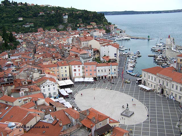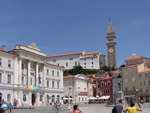 A délután a város megtekintésével folytatódott. Valóban egy gyöngyszem ez a hely. Érezhető az olaszos hatás. Szűk, kanyargós, sikátorszerű utcák, minden lekövezve természetes anyagokkal. Ahol lehet virágok, fák, igazi mediterrán hangulat. Nagyon szép és tágas a város főtere, a Tartinijev trg. Idáig hozott el egyébként bennünket a busz. Itt van a Városháza és Giuseppe Tartini zeneszerző szobra, szépen felújított palotaszerű épületek sora. A térről nyíló utcákban ajándékboltok sokasága árult emléktárgyakat, mindenki megtalálhatta a kedvére valót.