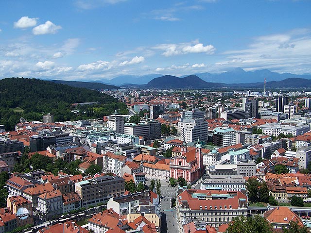 Sétánk a város főterére, a Presernov target-re vezetett. Nyitott teraszú kávézók, nyüzsgő élet, helyiek és külföldiek sokasága jellemzi e teret. Itt található a Franciskanska cerkev, a ferencesek két harangtornyú, barokk temploma.
