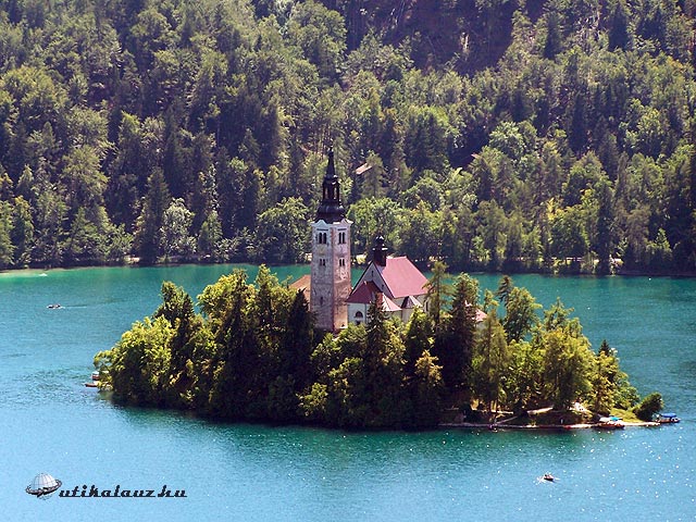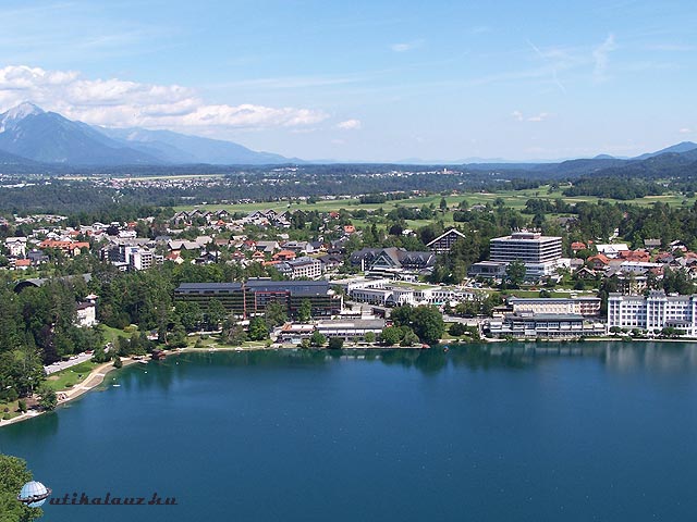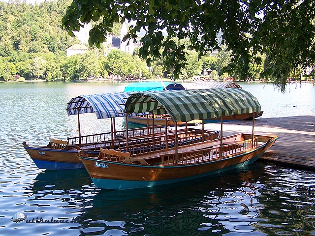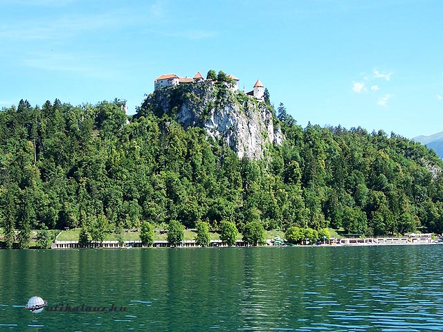 Bő egy órás út várt ránk, mert a 110 km-es távot majdnem végig autópályán tehettük meg. A város a Triglav Nemzeti Park peremén, a Júliai Alpokban, az azonos nevű tó partján található. Ljubljanától 55, Budapesttől 500 km-re. Bledbe érve a Hotel Krim mögött találtunk egy kitűnő, fák közötti parkolót, kellemes árnyékos helyet. Meglepően olcsón válthattunk egész napos parkolójegyet (4 EUR ). A tó gyönyörű környezetbe van beágyazva, vize kristálytiszta. A parti sétányon jutottunk el az első csónakkikötőig, ahonnan a Pletnának nevezett csónakok egyikének indulására kellett várni. Hamar összejött a kellő létszám, ami az indulás feltétele volt. Ezek a csónakok fából készültek, hosszú, páros evezővel hajtják őket. Méretük elég nagy, 20 személyesek. A jegy ára oda-vissza 12 EUR fejenként, amit a visszainduláskor kellett fizetni.