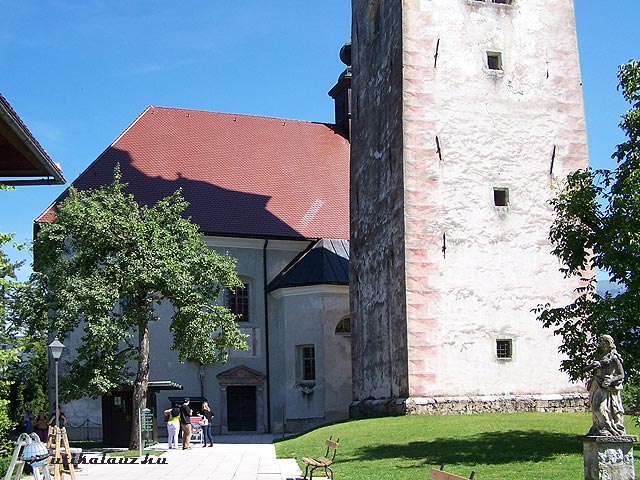6 EUR ellenében mindent megmászhatunk, megtekinthetünk. A XVII. századi barokk stílusú templomban nagyon szép oltárt, szószéket, freskókat, üveglapon keresztül a padlózatban régészeti leleteket tekinthetünk meg. Nem hagyhattuk ki, hogy megszólaltassuk a templom harangját. A legenda szerint, aki háromszor megszólaltatja ezt a harangot, annak teljesül a kívánsága. Felmentünk az 52 méter magas harangtoronyba is. Gyönyörű panoráma, nagyszerű rálátás a tóra volt a jutalmunk. Érdekes volt a toronyóra nyitott szerkezete is. Sietnünk kellett, mert félóra múlva indult a csónak a szárazföldre.