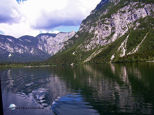 Rövid sétával már a kristály tiszta vizű tó partján voltunk. Míg várakoztunk a sétahajó indulására etettük a halakat és vízimadarakat. A jegy ára egy főnek 9 EUR, az út oda-vissza egy óra. A hajó hangtalanul siklott velünk, csodálhattuk a tó közvetlen környezetét, élővilágát, de a szép tiszta időnek köszönhetően a Júliai-Alpok távolabbi, helyenként havas csúcsai is kitűnően látszottak. A partot pedig többnyire a meredek sziklafalak alkották.