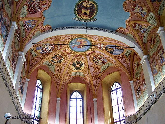 Találunk egy vártemplomot is szép freskókkal, különböző címerekkel.