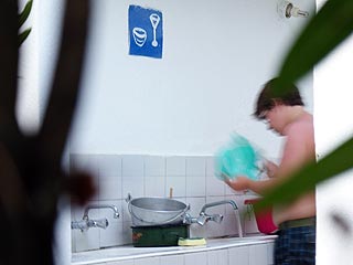 | A kemping előtti tábla | A kemping mosogatója |