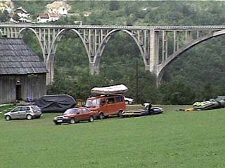 730 km és 14 óra autózás után értünk a Durdevicai betonhídhoz, itt volt egy farm, ahol a Camp tábla tövében öt gumicsónak, és egy tucat neoprén ruha száradt.Egy végtelenül egyszerű tábort találtunk, egy kisméretű kíváncsi tehénnel, négy-öt kiskutyával, méhkaptárakkal, fából ácsolt asztallal és padokkal, egy faházzal, egy vízcsappal, és egy tiszta, de a vízöblítés teljes komfortját nélkülöző, igazi, valódi, koedukált, ajtó nélküli árnyékszékkel.