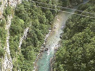 Másnap kisbusszal elvittek a túra induló pontjához, itt kiderült, hogy “marketing promocija” okok miatt csak összesen 100 Eurot kell fizetnünk a túráért. A Durmitor Nemzeti Parkot népszerűsítő fesztivál volt, ezért a raftingos vállalkozók összefogtak, és közösen indítottak karavánt a Tarán. Hát, mi ezt nem bántuk. A Tara nagyon alacson vízálláson volt, ilyenkor csak mentőmellényt adnak fel, a zúgó szintek is 60-120 cm közöttiek, gyors a folyó, de inkább csak csónakáztunk. A víz nagyon tiszta, iható. Útközben egyszer kikötöttünk, egy kb 20 m magas vízesésnél, nagyon szép volt. Kisbusszal mentünk vissza a túra végén a táborba, állati keskeny földutakon, meredek szakadékok mellett, többször láttunk lezuhant teherautókat, ha leesnek, a fák miatt fel sem tudják többé vontatni.