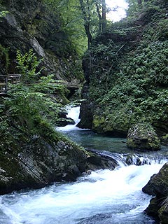 Utunkat a Vintgar-szurdok felé vettük. Ez a hely már csak azért is kivételes, mert rendesen ki van táblázva az oda vezető út, és ez sok szlovén látnivalóról nem mondható el. Zgornje Gorjeból ez mindössze 10 perc. A Vintgar-szurdokot nem érdemes kihagyni, szépségben vetekszik a Békás-szorossal, márpedig ez tőlem, Erdély-mániástól nagy szó. Hatalmas sziklafalak mellett fapallón vezet az út végig egy gyönyörű és tisztavizű patak melett/felett. A szurdok végéből kisebb kaptatóval el lehet jutni a Szent Katalin templomhoz.