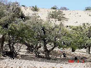 ami szép tiszta volt, kifogástalan műszaki állapotban. Elindultunk északra Essauirába, ami 190 km távolságra van Agadírtól. Csodás tengerparti út, lájtosan úgy 3 óra kocsival. Eltévedni nem lehet, mivel csak egy út van lebetonozva. Út közben nem nagyon álltunk meg, mivel inkább a lakott településekre akartuk csekély kis időnket fordítani. Egy alkalommal azért kivételt tettünk. Az útikönyvek egyfolytában arról írnak, hogy a nagy szárasság miatt a környéken egyedüliként megélő argana fára az éhes kecskék érdekes módon felmásznak, és a fa lombkoronájában legelik a leveleket. Egy ilyen fánál megálltunk fényképezni.