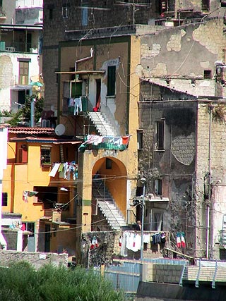 Herculaneum – Nápoly külvárosa – üdítő kivétel: egy bel-budai kerületre jellemző beépítettségű városka, ahol a nyílt utcán való szombat délelőtti parkolásunk során inzultus nem érte a gépsárkányt. De itt is van őrzött parkoló a romkerttől kissé délre; ha megnyugtató: tessék nyugodtan igénybe venni.
