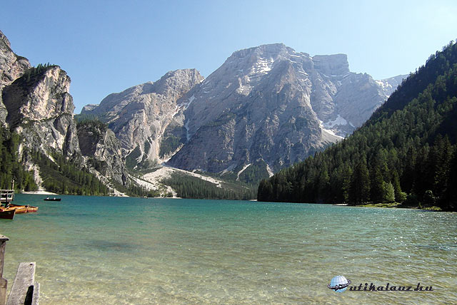 Következő úticélunk az 1496 méter magasan fekvő Pragser Wildsee volt, mely az Alpok egyik legszebb tava, de Dél-Tirolban mindenképpen a legszebb. Már az odavezető út is nagyon szép. A parkolás után (3 euro), gyalog közelítettük meg a tavat. Csodás látvány. Vizében tükröződik a 2810 méter magas Seekofel, a víz kristálytiszta, a környezet elragadó. A tó vízszintje olvadás után, júniusban a legmagasabb, márciusban akár 3-4 méterrel is alacsonyabb lehet. Hivatalosan fürdőtó, hiszen nyáron akár 14-15 °C-ra is felmelegszik a vize, és már májusban elolvad róla a jég. Nem láttunk senkit úszkálni, de mi azért bokáig bemerészkedtünk a vízbe, ami igencsak hideg volt.