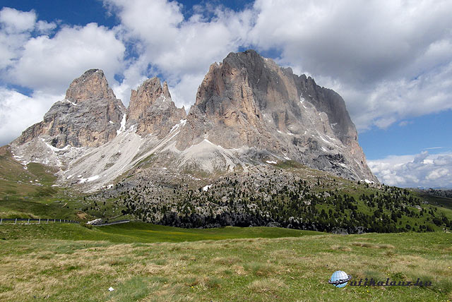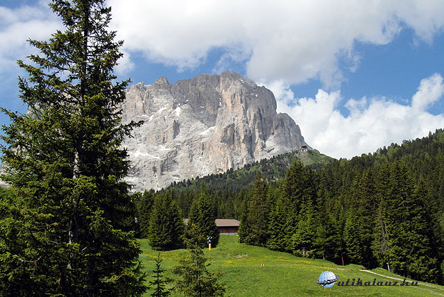 Wolkenstein után az út kettéágazik. Az egyik a Grödner-hágó, a másik a Sella-hágó felé vezet. Mi a Sella-hágó felé indultunk. Gyönyörű tájak, hegyek, alpesi rétek és igencsak kanyargós, meredek szerpentin. Így értünk fel a 2240 méter magas Sella-hágóhoz. Ilyen magasan még nem jártam gyalog sem, nemhogy autóval.