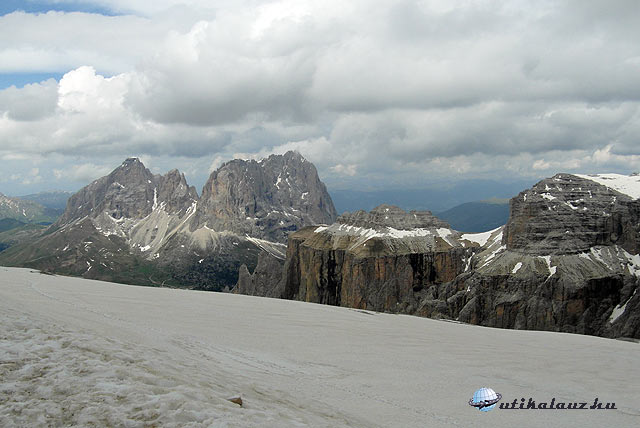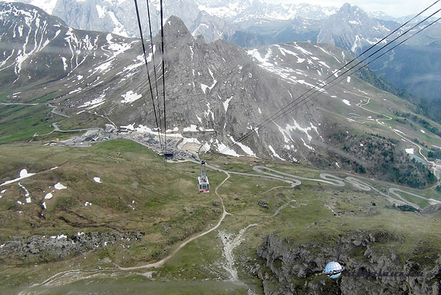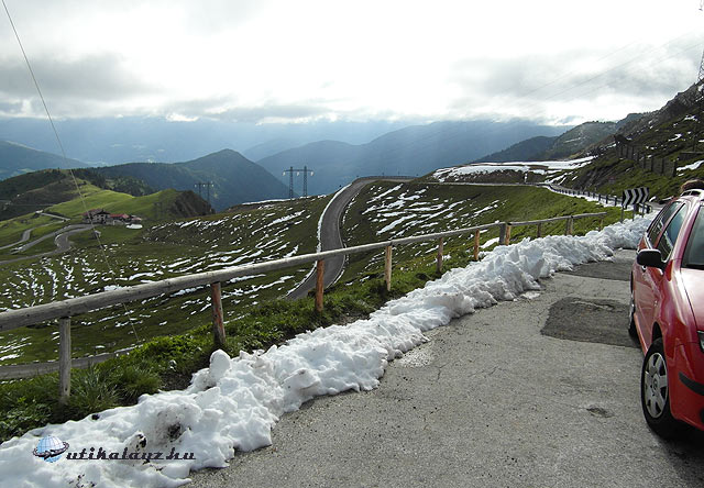 Ezután a híres Pordoi-hágó felé vettük az irányt. Az úton az egyik kanyar a másik után, valamint rengeteg motoros és kerékpáros. Igencsak oda kellett figyelni. A hágó tetején (2239 m) nagy, ingyenes parkoló. Itt leálltunk, majd élveztünk kicsit a látványt, fotózkodtunk, majd a kabinos felvonóval felmentünk a 2950 m magas pordoi csúcsra. A retúrjegy 15 euro, a gyerekeknek 8. A látvány lenyűgöző volt, megérte felmenni. Mikor felértünk a kilátás fantasztikus volt. A hatalmas hómező, a környező hegyek látványa elvarázsolt bennünket. Legalább 15 cm-es hó borította a fennsíkot június végén. Mivel még nem láttunk ilyet, nagy élmény volt. Vétek lett volna kihagyni egy hógolyó-csatát a kicsi fiammal.