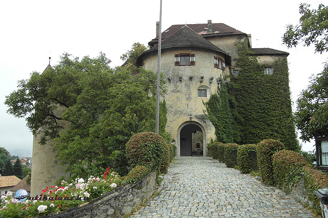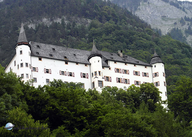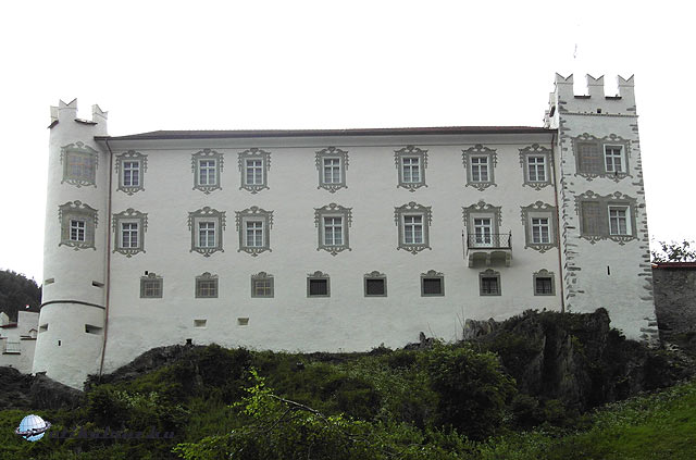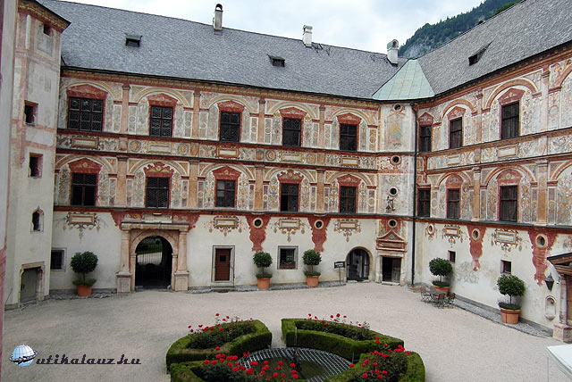 A Brenner-hágó- Innsbruck közötti autópályaszakaszra nem érvényes a matrica, 8, 5 euro az útdíj. Mi az autópályával párhuzamos főúton indultunk el Észak-Tirol egyik legszebb és legismertebb várkastélyához. Az Innsbrucktól 30 km-re, Stans és Jenbach között található Tratzberg várkastély rendkívül népszerű kirándulóhely. Az út szép, ám a haladás meglehetősen lassú volt. Kis falvakon, kanyargós utakon mentünk keresztül, néha olyan keskeny volt az út, hogy egy kamion talán el sem fért volna. Így már érthető, miért választják inkább a fizetős autópályát. Ez az út csak a ráérős, nézegetős turistáknak való. Azaz nekünk. Jó két órás autózás után meg is érkeztünk. A nagy és ingyenes parkolótól kisvonattal, vagy gyalogosan 20 perces sétával juthatunk fel a kastélyhoz. A belépő elég drága, de igencsak megéri. Felnőtt 13 euro, gyerek 7, 5, családi jegy sajnos nincs. Van viszont magyar nyelvű audio-guide, ami azt jelzi, hogy itt bizony már nem ritka a magyar látogató. És nem ám valami száraz géphang, hanem a kastély hajdani ura és úrnője kalauzol végig egyes szám első személyben, hibátlan magyarsággal, a rendkívül látványos érdekes termeken. A kastély berendezése eredeti, és tetszetős. Ez az egyik legszebb kastélybelső, amit eddig láttunk. Sajnos fényképezni nem lehet, pedig lenne mit. Így aztán csak (ami egyébként nagyon szép) a reneszánsz belső udvarról tudtam felvételeket készíteni. A kastélyra csak az Inn túlsó partjáról lehet jól rálátni, egyébként takarják a fák.