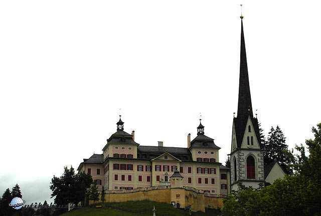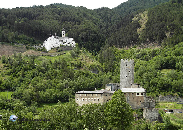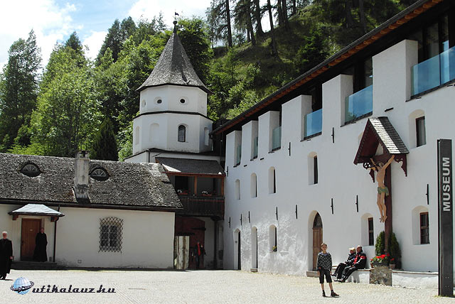 A várlátogatás után a közeli Burgeisbe mentünk. A falu fölött áll a hajdani püspökvár, a Fürstenburg. A vár fölött pedig a Marienberg kolostor, a világ legmagasabban fekvő Benedek-rendi kolostora. Nagyon szép, a tájba harmonikusan illeszkedő épület. Tudták a régiek, hová kell építkezni. Először a kolostort néztük meg. Nagyon tetszett, de a panoráma is „megér egy misét. ”