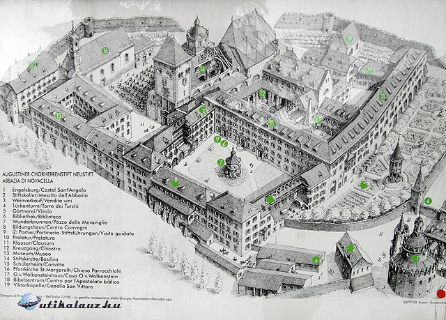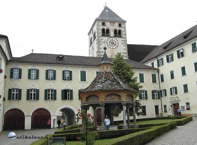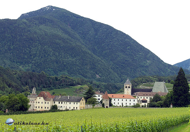 Ezután visszatértünk az Eisack völgyébe. Úticélunk Dél-Tirol egyik legjelentősebb műemléke, a Vahrn külvárosában található Neustift apátság. A kolostor arculatát az 1734-es nagyszabású barokk alakítás határozza meg, de láthatunk itt román és gótikus részleteket is. A belső udvaron áll a nyolcszögletű „Csodák kútja”, melynek freskói az ókori világ hét csodáját ábrázolják, nyolcadik a Neustift kolostor. Igen tetszetős még az „Angyalvár”, amely egy kör alakú kápolna, és az apátsági templom, valamint a kerengő. Jelentős a kolostor borászata, de nem csak bort, hanem szappant, mézet, cukorkát, likőrt és még számos terméket állítanak elő, amit a kolostor üzletében meg lehet vásárolni. Mindegyik ízléses, színvonalas áru. Nem jártuk be a kolostor minden zugát, de a főbb látnivalókat megnéztük, majd elindultunk hazafelé. Az idő egész nap borongós, hideg volt, de eső nélkül megúsztuk.