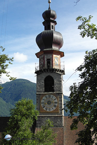 Reggelre visszatért a nyári idő. Első utunk a közeli Bruneckbe vezetett. Nagyon szép város. Nevét a városalapító Bruno püspökről kapta, az őt ábrázoló freskót a Rageni kapun meg is néztük. Az óváros házai mind szépek, rendezettek, az utcák tiszták. A város fölött magasodó vár ma is a brixeni püspök tulajdona. Egy híres hegymászó, Reinhold Messner gyűjteménye van itt kiállítva. (tibeti tárgyak, maszkok stb. ) A vár még zárva volt, a nyitást nem vártuk meg, inkább leballagtunk a vár alatti Szent Katalin templomhoz, melynek hagymakupolája a városkép egyik jellegzetessége. Innen a folyópartra mentünk (Brunecket a gyors folyású Rienz folyó szeli ketté), ahol megnéztük a város legrégebbi épületét, a freskóval díszített Hannes malmot. Bruneck nagyon megnyerte a tetszésünket, az egyik legszebb város Dél-Tirolban.
