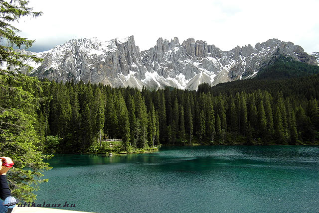 Trostburg megtekintése után elindultunk az „ezerszínű” Karer-tó felé, amely az egyik legszebb és legismertebb tó Dél-Tirolban. A parkoló sorompós rendszerű, fizetés időarányosan, mint a parkolóházakban. A tavat egy alagúton keresztül lehet megközelíteni. Szerencsére magas volt a vízszint, így teljes szépségében csodálhattuk meg. A parti fenyves mögött a 2794 méter magas Latemar sziklacsúcsai fehérlenek. Sajnos az ég befelhősödött, így a hegycsúcsok összeolvadtak a szürke éggel, így nem tudtam igazán szép képeket készíteni. Egy azúrkék égbolt sokkal szebb lett volna háttérnek, de ne legyek elégedetlen, szerencsére az eső nem esett. A tó körüli utat Erzsébet-sétánynak hívják, ugyanis egyik kedvenc kirándulóhelye volt ez Ferenc Józsefné, született Wittelsbach Erzsébetnek, közismert nevén Sissynek. A legenda szerint a tóban sellők élnek, az egyikük elfogott egy szivárványt, és lehúzta a mélybe. Ennek köszönhető, hogy ezer színben tündököl ez a tó.