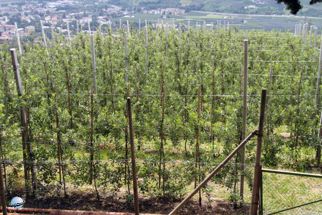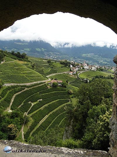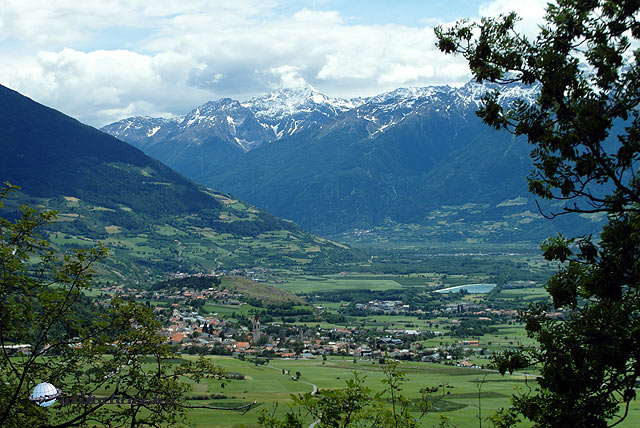 St. Leonardnál érkezik le az út a Jaufen-hágótól a Passei-völgybe. Innen már „egyenes” az út Meranig. Meran forgalmas, kissé zsúfolt város, a Vinschgau kapuja. Miután kiértünk a városból, elég lassan tudtunk haladni. Sok volt a kamion, és nagy a forgalom. Az út mentén végig hatalmas almaültetvények. Nagyon közel ültetik egymáshoz a fákat, és erősen visszametszik, mintha szőlőlugas lenne. Sok helyen jégháló van kifeszítve, és öntözik is a fákat. Egy agrármérnök ismerősöm szerint húsz évvel előttünk járnak az almatermesztésben.