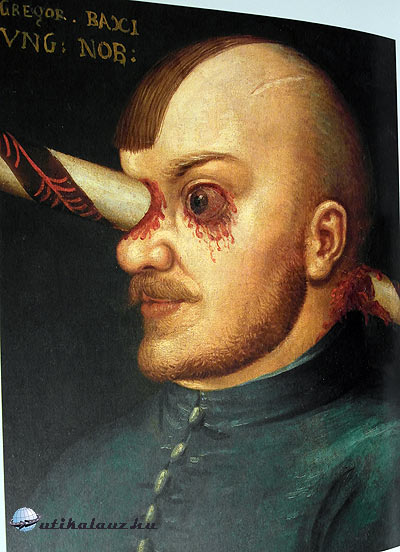 A galéria képei között a Habsburg család szinte minden tagját láthatjuk. A fegyverterem is jelentős látnivaló, látogatásunkkor pedig egy időszaki kiállítás volt megtekinthető, „Lovagok” címmel. Így aztán még több lovagi páncél és fegyverzet volt kiállítva. Vezetés nincs, minden teremben szabad fényképezni, egyet kivéve. Pedig ott látható egy különleges portré, ami miatt elsősorban meglátogattuk akastélyt. A 400 éves portré a felirat szerint egy magyar nemest (ungarische nobilis) ábrázol, akit Gregor Baxinak hívtak. Az az érdekes a dologban, hogy az illető fejét, egy kelevéz (dárdához hasonló fegyver) fúrta át. A szemén hatolt be, és a tarkóján jött ki. De ez még mind semmi! Ezzel a sebbel még egy évig élt (bár bizonyára néha szúró fejfájásról panaszkodott), és akkor is sebfertőzésbe halt bele. A kelevézt nem húzták ki a fejéből, hisz akkor rögtön meghalt volna, csak lefűrészelték. Az osztrák tájékoztató szerint Gregor Baxi lovagi torna során sérült meg, nevét pedig tévesen, Baci Györgyre fordították. Azonban ez nem pontosan így van. A kép Baksaházi Baksa (Baksi) Márkot ábrázolja, aki Győr 1598-as ostrománál sebesült meg. A lovagi tornák ideje ekkor már lejárt. Felépülése után, még több csatában is harcolt, és mint az elején említettem, sebfertőzésben halt meg. Ez akkora szenzáció volt abban az időben, hogy egész Európát bejárta híre, több portré és metszet is készült róla.