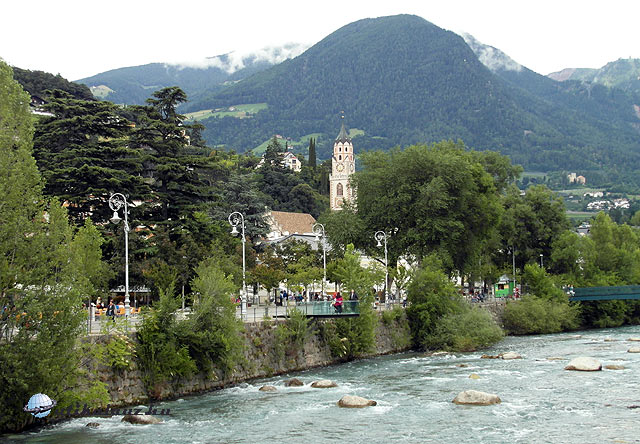 Meranon már kétszer átutaztunk, mostmár illendő volt szét is nézni. Egy parkolóházban találtunk helyet (2,30/óra), majd elindultunk felfedezni a várost. A parkokban pálma, leander, ciprus, igazi déli hangulat, szubalpin klíma. Az óváros egész szép, de láttunk már szebbet is. Legjobb része talán a Bozeni-kapu környéke.