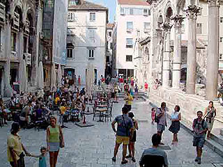 Délután 3 óra felé indultunk el Trogirból Split felé. Az óvárostól északkeletre, az Aranykaputól nem messze találtunk parkolót. Gergely püspök 7 méteres szobra most is túl nagynak tűnt a környezetéhez képest. Ez van. A Diocletianus palota közepén hatalmas tömeg. A teret szegélyező lépcsők és az oszlopok talapzatai tele voltak pihenő, nézelődő turistákkal. Kicsit bolyongtunk a szűk utcákon, megnéztük a tenger felé vezető “Bronzkapú” alatti bazárt, aztán indultunk tovább Dubrovnikba.