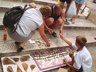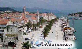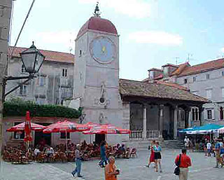 Útközben rövid sétát tettünk Trogirban. (665 km) Az óvárost az újabb résztől elválasztó csatorna partján, a piac szélén álltunk meg. Az óvárosi sétát a városháza felé kezdtük. A déli órák ellenére rengeteg volt a turista. Igaz, aki tehette, árnyékba húzódott. Mi is a 700 éve álló városi loggia (nyitott bírósági ítélkező hely) viszonylag hűvös kőpadján ülve nyaltuk el első fagyinkat. (A “gombóconként” 4 kunáért – 144 forintért. Azzal vigasztaltuk magunkat, hogy kehelyben kétszer ennyibe kerülne.)