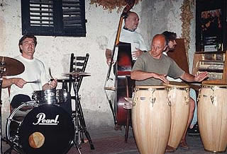 A Mi Asszonyunk dóm sarkánál, a Hard jazz cafe előtt is már kezdett gyülekezni a nép. Rengetegen ültek a szűk sikátorokba kirakott asztalok mellett is. A fehér kövekből készült házak sajátos színt kaptak a reflektorok sárga fényétől.
