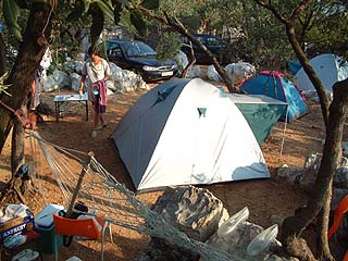 Az első éjszakát Primostenben töltöttük az Adriatic kempingben.(631 km) Az egész olyan volt mint egy csenevész fenyőkkel tarkított sziklakert. A cövekek leverésével sokáig kínlódtam, végül feladtam. A könnyen hajló drótokat nem a barnás-vörös zúzalékkal, és kisebb nagyobb kövekkel borított sziklás talajhoz tervezték. Nem volt más lehetőség, nagyobb kövekkel rögzítettem a sátor sarkait és a feszítő kötelek végét.