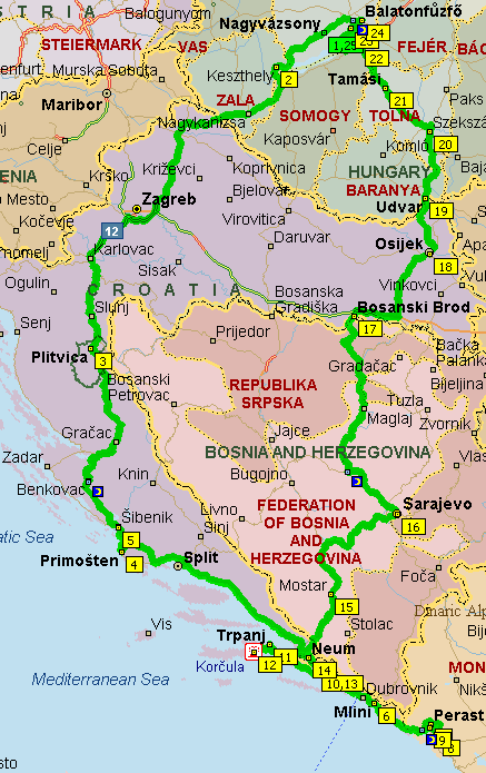 Útközben egy közel 10 kilométeres szakaszon – 842 km – áthajtottunk a Horvátországot ketté vágó Bosznián. Három határállomás, illetve rendőri őrhelyet láttunk az út mellett – talán két horvát és egy bosnyák -, de mindegyik helyen kis lassítás után tovább intettek bennünket.