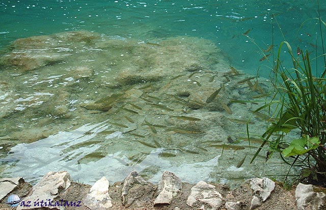 A víznyelőket, kisebb-nagyobb vízeséseket sokszor az indulásuknál és a leérkezésüknél egyaránt meg tudtuk nézni, s persze hallgatni. Különleges látványt nyújtanak maguk a tavak is a türkizkék, néhol smaragdzöld színükkel. Mintha az Adria mélykék vízébe egy kis tejet engedtek volna, hogy ettől fehéres, opálos színt kapjanak. Nagyon mélyre le lehet látni bennük. Sok hal van a vízben és mindenféle mésszel bevont fadarabok.